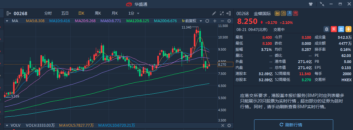 对于这样的业绩,8月16日,金蝶以8.0港币开盘,距离前日收盘价跌幅为10.11%。收盘价为港币8.28元,当日跌幅为6.97%,总市值272亿港币。