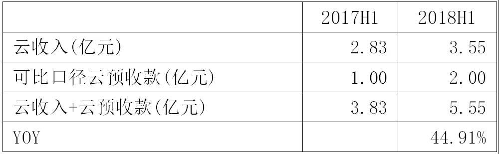 根据公司8月16日业绩交流会披露,以可比口径计算,公司2017年半年报云预收款约为1亿人民币(部分递延收入);2018年H1同期云预收款约为2亿人民币(部分递延收入+部分合同负债)。