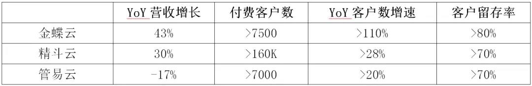 精斗云面向小微商户,更多为互联网市场,28%的客户增速与30%的营收增速较为匹配,70%的客户留存率在互联网属性更强的小微市场不过不失。