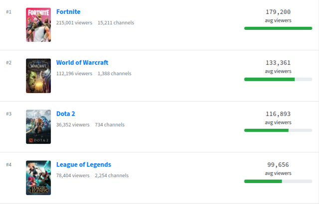 在《堡垒之夜》的设定中,100名玩家将降落在一个岛上,争取在风暴之下存活。《堡垒之夜》的一大成功之处在于其观赏性。从Twitch(国外知名游戏直播平台)这个月的数据来看,《堡垒之夜》热度遥遥领先。人们观看《堡垒之夜》直播的热情,是开展相关电竞比赛的基础,也预示着广告变现的可能。