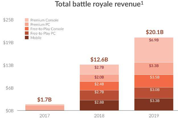 此外,对游戏的喜爱将推动玩家进行消费。“吃鸡”类(“大逃杀”模式)游戏紧张刺激,可玩性极高,俘获了一大批粉丝。据SuperData预测,2018年度免费“吃鸡”类游戏的营收约为50亿美元,其中一大部分来自《堡垒之夜》。就目前来看,这种规模的收入还将持续一段时间。