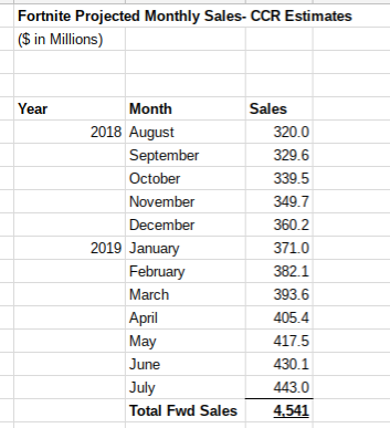 近四年来,电子游戏行业蓬勃发展。《堡垒之夜》的无限可玩性及庞大的玩家基础,与近年来人气极高、吸金无数的《英雄联盟》极为相似。5月份《堡垒之夜》的销售额超过3亿美元,将来有望在此基础上持续增长。笔者对《堡垒之夜》未来12个月的营收预期收益为40亿美元至50亿美元。假如8月份营收为3.2亿美元,月复合增长率为3%,那么未来12个月营收估计将达到45亿美元。