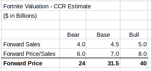 在这一部分,Epic的主要资产为虚幻引擎,营收主要来自于向该引擎使用者收取的费用。由于缺乏公开信息,很难估算虚幻引擎的确切销售额,但预计收入相当可观。Epic从使用引擎的所有游戏中获取一定比例的收入,比如从《绝地求生》游戏的销售中获得了部分收入。笔者预计来自虚幻引擎的年收入在10亿美元到20亿美元之间。再考虑到结构性利好因素和当前行业的市销率(6至8倍),B2B业务的市值可能在60亿美元至100亿美元之间。