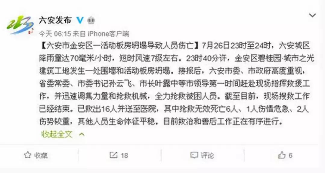 7月26日,安徽六安城市之光项目工地坍塌,造成6人死亡,多人受伤;