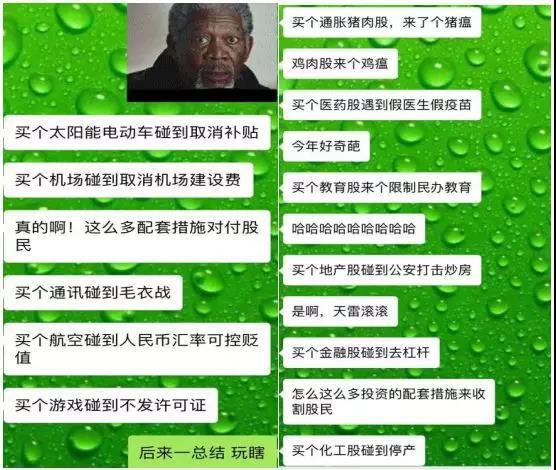 近期的股民真是惨,买啥啥踩雷,买医药股遇到疫苗造假,买机场股遇到取消机场建设费,买光伏和新能源遇到补贴下滑,买影视股遇到冰冰逃税,买养猪股遇到猪瘟……