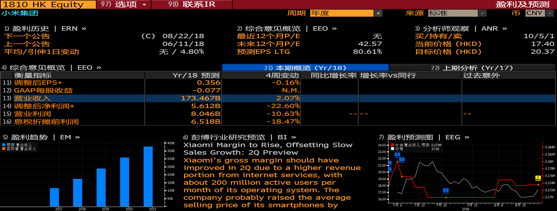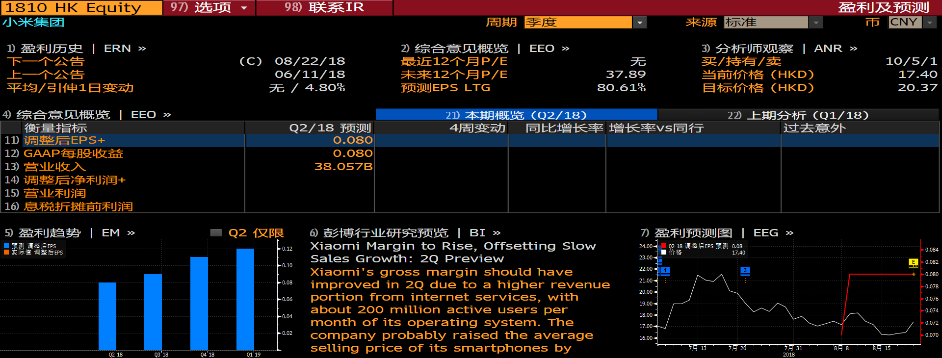 小米2018年第二季度取得收入人民币452亿元,同比增长68.3%。经调整利润同比增长25.1%至人民币21亿元。18Q2的市场预期不是很明朗 ,仅高盛一家给出了营收380亿元,每股收益(GAAP)0.08,也就是净利润(GAAP)18亿元的预期。而全年的彭博一致预期是1734亿元,净利润(Non-GAAP)56亿元。所以整体上看,营收和净利都是超预期的。