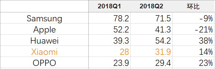 财报披露,2018年第二季度智能手机分部的收入约人民币305亿元,同比增长58.7%。该季度智能手机销量高达32.0百万部,同比增长43.9%;18Q2,在中国大陆智能手机的平均售价于2018年第二季度同比增长超过25%;平均售价超过人民币2,000元的旗舰机小米8系列在推出首月的销量便突破110万部。