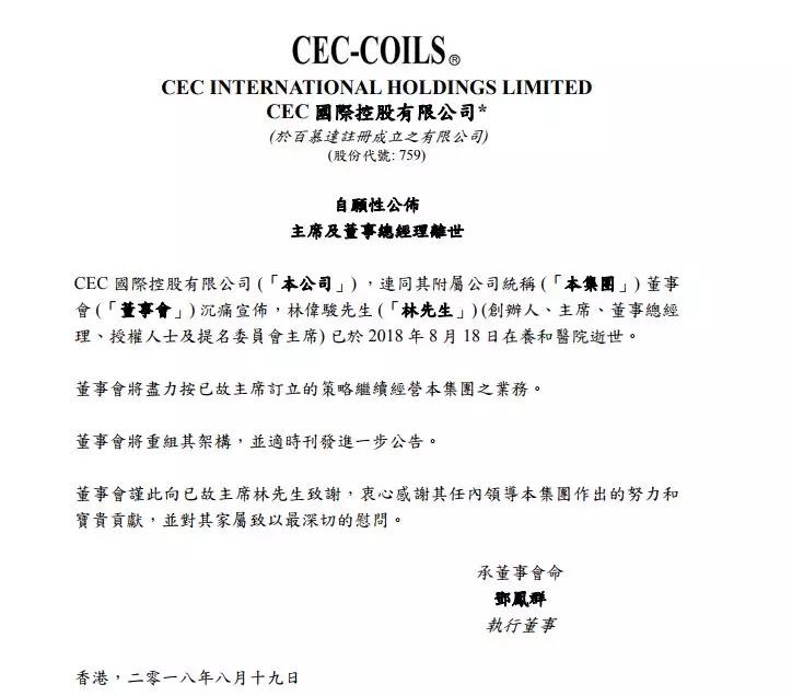 上周日晚间,CEC国际(0759.HK)发布公告,林伟骏(公司创办人、主席、董事总经理、授权人士及提名委员会主席) 已于2018 年8月18日在养和医院逝世。