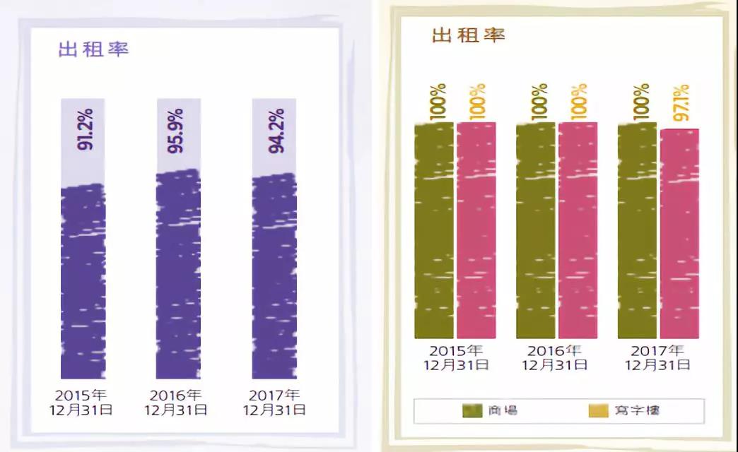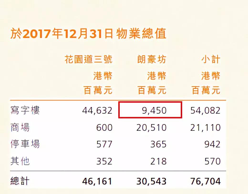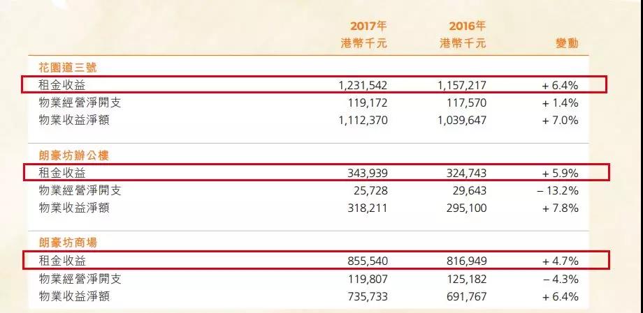 根据公司2017年财报显示,三处物业的总租金收益高达24.31亿港元,同比增长5.7%。其中,朗豪坊办公楼的租金收益约为3.44亿港元,同比增长5.9%,物业估值为94.5亿港元,出租率常年维持在100%。