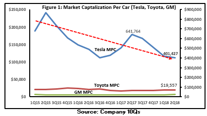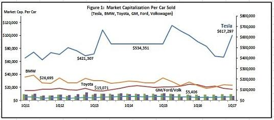 先说下MPC概念,指的是每辆售出汽车对应的市值,相当于每股东对每辆汽车付出的代价,下图选择了几大车企作对比,包括通用汽车、丰田、福特、大众和宝马;过去6年,通用汽车、福特及大众对应的MPC范围介于5400至9000美元,宝马及丰田平均MPC分别为2.5万及1.5万美元,相比之下特斯拉MPC高达50万美元,是大多数车厂的几十倍。