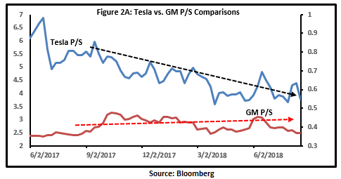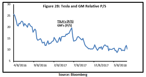 市销率指标显示的规律相似,持续高于通用汽车,但17年以来明显下滑,跌幅高达30%,同通用汽车的差距大幅缩小。