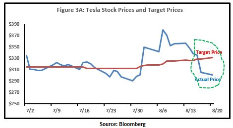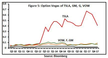 从期权交易的角度,VEGA指标反映的是期权价格对波动的敏感性分析,指标越高意味着高波动带来更高的期权价格。下图是以布莱克-肖尔斯(Black and Scholes)期权定价模型计算的2010年以来各季末的1年期期权Vega,以通用汽车、福特及大众作参考对比,可以看出过去7年公司vega极速上涨,大幅领先其他车企,不过在17年开始极速下滑,此前的高溢价如今有所缩窄。