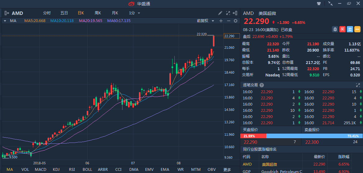 从发布超预期财报到之后激进的产品技术更新,芯片公司AMD(AMD)持续获得市场热捧,公司加速了芯片研发周期,宣布今年年底前努力完成两款7nm芯片产品:Rome和Vega 20,受消息影响股价大涨6.65%。下文将简要分析公司在中国的市场进展及机遇。