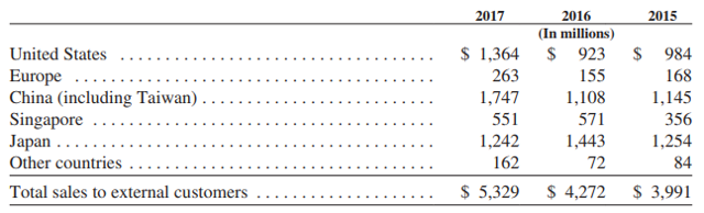 按地区分析公司17年年报,可以看出中国地区(含台湾)营收占总营收的比例最高,其次是美国本土及日本,17年中国地区营收同比增速高达58%,占总营收比例已超过30%,可以说中国地区是公司的第一大市场,有望继续贡献业绩。