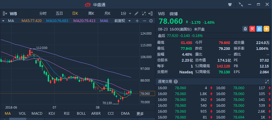 在远期市盈率为30倍的情况下,假设19年每股收益为3.93美元,那么18年微博对应的股价将是117.90美元;假设20年每股收益为5.41美元,那么19年对应的股价将是162.30美元。因此,微博还有一定的上涨空间。