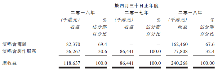 公司筹办逾20名艺人逾260场表演,向超过280场由其他第三方演唱会筹办者筹办的演出提供制作服务。根据灼识企业管理咨询报告,截至2018年4月30止年度,按设有逾10000个座位的演出大厅和大型表演场地举办的演唱会场次计算,公司为香港演唱会参与者中五大演唱会制作集团之一。