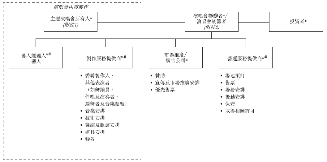 公司的业务模式为按照演唱会筹办和提供演唱会制作服务两个主要业务分布营运。香港、中国内地及海外演唱会组织价值链中的服务范围可划分为四个方面:内容创作及演唱会策划、宣传及市场推广、制作或舞台营运规划及执行、表演。根据不同客户的特定需求定制不同的服务,价值链如下图所示。