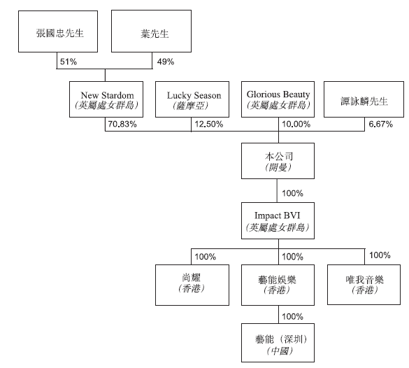 公司的股权结构如下图所示,主要控制人为张国忠先生和叶伟忠先生,两人通过New Stardom控制本公司,分别持有New Stardom 51%及49%的股权。另外,谭咏麟先生持有公司6.67%的股份,并且其绝大多数的演唱会由公司承办。