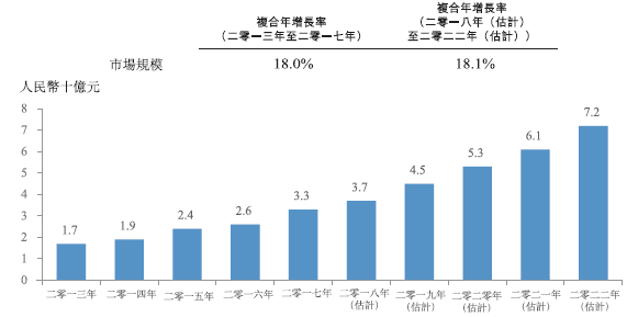 中国的演唱会市场增长受益于中国经济的稳定增长,增速更高,从2013年的17亿人民币增至2017年的33亿人民币,复合年增长率达18.0%,且预计2018年至2022年复合年增长率将达18.1%,于2022年至72亿人民币。