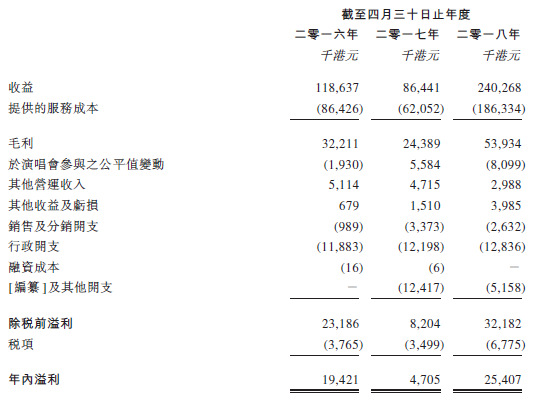 近三年的利润表如下图所示,所有收益均来自于演唱会举办及提供演唱会制作服务,截至2016年、2017年、2018年4月30日,演唱会举办业务分别占总收益的69.4%、0及67.6%。其中2017财年未曾举办演唱会是因为更多地专注提供演唱会制作服务及投资其他人士筹办的演唱会,但也说明演唱会举办具有较大的波动性,跟合作艺人的关系也非常重要。其中与谭咏麟先生的关系尤为重要,截至2016年、2017年、2018年4月30日,谭咏麟先生的一项个人演唱会主题下的演出贡献的收益分别为1410万港元、4830万港元及7540万港元,收益占比分别为11.8%、55.9%及31.4。同期,谭咏麟先生也与其他艺人共同进行两项演唱会主题的表演,相关收益分别为5160万港元、430万港元及9520港元,分别占当期总收益的43.5%、5.0%及39.6%。