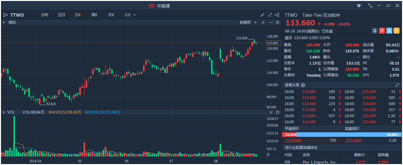 在上次8月16日介绍了TTWO之后,公司股价突破130美元大关,并在周二再次创出历史新高,目前公司股价为133.66美元。随着10月份期待已久的新作《荒野大镖客:救赎2》的发布,《NBA2K 19》引入中国市场以及在任天堂Switch上的发布,将进一步催化市场情绪。