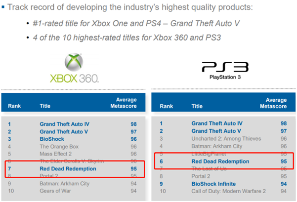 《荒野大镖客:救赎》是出自Rockstar工作室的代表作品之一,其一代作品就被著名游戏评测网站Metacritic给出95分的高分,在XBOX及PS3平台上,都是名列前茅的优秀作品,在全球范围内拥有无数粉丝。预计该系列新作一年内销量将超过1000万份,而且后续DLC的发布将持续为公司带来收入。