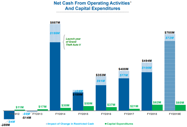 经过2014年《GTA5》的热卖,TTWO的现金保持充盈,通过下图可知,公司经营现金流从2015年以来始终保持上升,而且每年均有5000万左右的资本开支,增强公司经营能力,增加新的盈利模式。