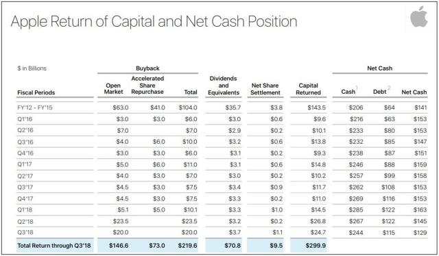 所以,基于上述分析,苹果接下来更应该提高分红。这对苹果并不困难,因为苹果目前资产负债表非常健康,拥有大量的自由现金。最近的财报显示苹果进行了3000亿美元的股票回购。下表显示了苹果的现金状况和回报股东的方式。