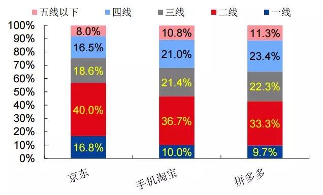 拼多多定位高性价比,符合部分收入较低水平消费者的需求。从拼多多的用户比例来看,也是如此。其三线及以下的客户占比达到了57%,高于京东的43.2%和淘宝的53.3%。