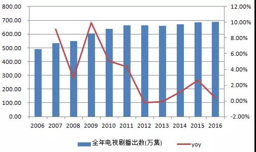 我们再看看另一个指标 —— 全年电视剧播出数(万集),自2007年以来,电视剧播出数逐年上升,但其增速反而有所下降,可见“口红效应”的理论并不成立。