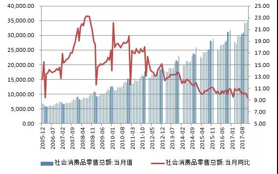 其中,汽车消费达到21,698亿元,占总额的10%左右,而从去年开始,汽车消费零售额持续下行,2017年7月增速为-0.2%,极大的拖累了社零数据,其他生活性支出表现却相对稳定。