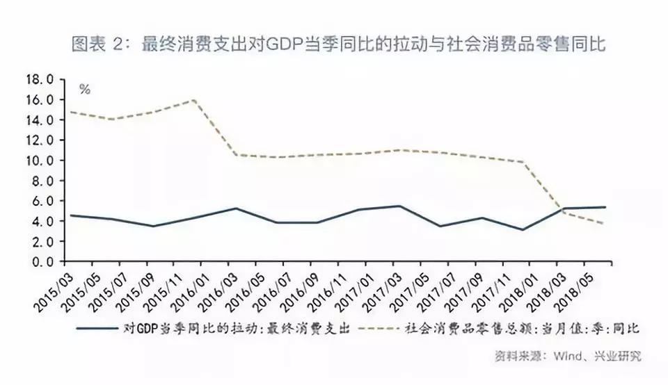 通过对比最终消费支出和社会消费品零售总额数据,我们可以观测到,2018年以来,最终消费对GDP当季同比的拉动上升,这反映了居民服务消费支撑了最终消费。