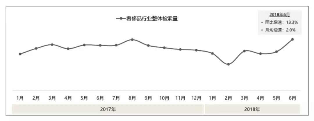 根据360大数据《奢侈品行业报告》,2017年奢侈品行业整体搜索趋势平稳,而从2018年第二季度开始,奢侈品行业整体搜索量显著增长,其中,2018年6月行业整体检索量同比增加13.3%。