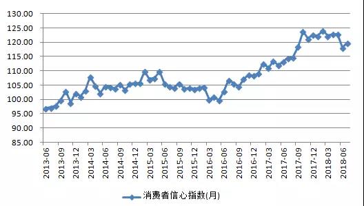 另外,根据国家统计局公布的消费者信心指数,2018年7月,中国消费者信心指数为119.7点,仍保持高位运行。