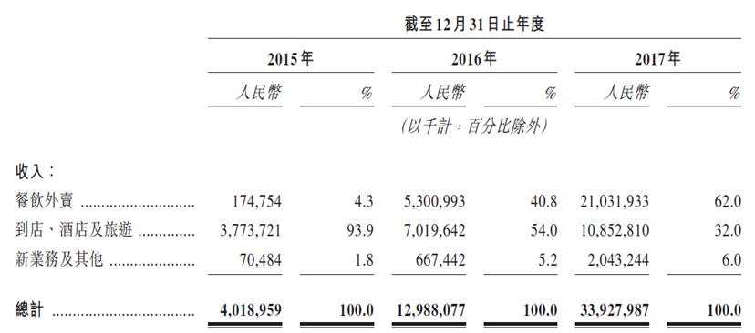 从招股书中了解到,美团2017年营业收入339亿,主要分为三块:1、餐饮外卖;2、到店业务,包括酒店和旅游;3、新业务:包括共享单车和网约车业务。光是外卖业务就贡献了62%的收入。