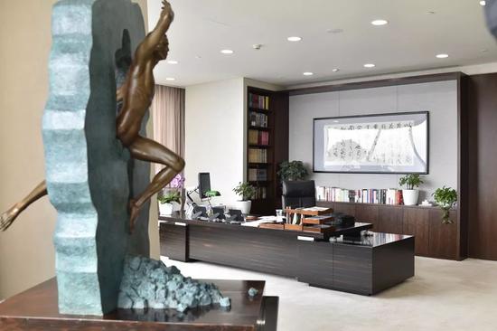 王健林的办公室很大,大理石墙面、红木家具、皮沙发构成了主要基调,而最吸引眼球的就是墙上的山水画,他个人办公桌后面的那幅画是石齐的作品《山水》,据说这幅画的市值大概为2000万人民币。