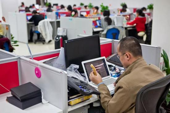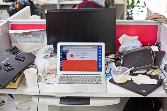 耿直boy王兴没有自己的办公室,图片中的办公桌是早些年的,只有用一个字“乱”来形容了。目前,在美团总部,他依然和员工一起坐在大平面空间。这个典型的技术男,一个小小的办公区域放了三台电脑,吃着饭也要工作,有才华又勤奋。小编只是深深地为坐在他工位旁边的朋友捏了一把汗。