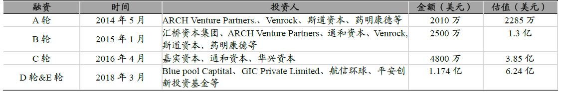 公司近年来持续获得风投看好,从14年5月的A轮到18 年3 月完成1.174 亿美元的D 轮和E 轮融资,先后五轮总计获得约2 亿美金投资。前三大股东为专注投资早期生命科技公司的ARCH Venture Partners、美国著名风投基金Venrock及富达集团下属斯道资本,分别持有15.07%,12.46%,6.74%。此外,投资人还包括药明康德创始人李革夫妇以及李革持有30%的Wuxi Healthcare Ventures ,持股分别达到3.37%和8.92%。