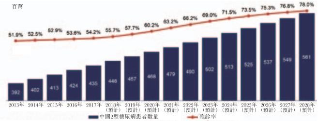 近几年生活方式及人口老龄化的巨变加速了糖尿病蔓延,弗若斯特沙利文数据显示,2017年全球约有4.53亿人患有糖尿病,大部分集中于发展中国家,其中约95%(4.35亿)为2型糖尿病患者,预计2028年增至5.61亿,其中中国2型糖尿病患者最多,17年达到1.2亿,预计到2028年将升至1.8亿;随着经济发展、健康意识提升,全球确诊率将持续提升,新兴市场中国确诊率有望从17年的47.7%增至2028年的82.2%。