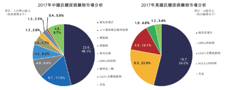 治疗方案而言,胰岛素均占中国及美国抗糖尿病市场最大份额,中国市场抗糖尿病药主要以传统药物为主,DPP-4、GLP-1 及SGLT-2 抑制剂等创新药物的销售收入较少。除了胰岛素外,α-葡萄糖甘酶抑制剂及双胍类二甲双胍亦因其价格相宜、降糖效果显着、具有降低心血管疾病风险等其他临床效益而在中国占有重大市场份额。美国则以DPP-4、GLP-1 及SGLT-2 抑制剂等创新药物为主要药物,销售占总市场比例高达42.6%。