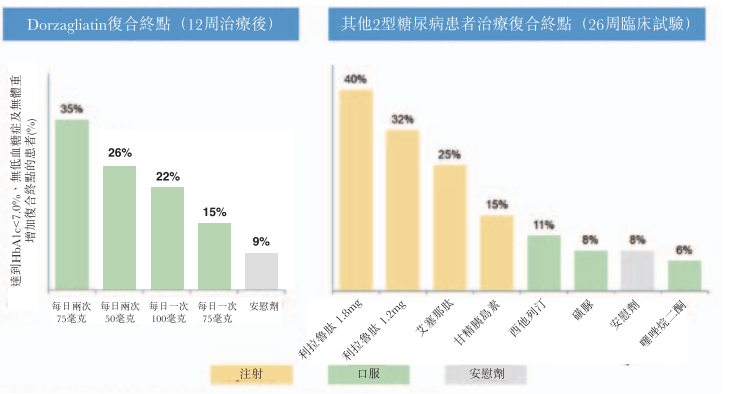 复合终点包括三个临床终点:(i)HbA1c水平低于7.0%的血糖控制(ii)无体重增长(iii)无低血糖症(危险的低血糖水平)。Dorzagliatin在12周治疗后在每日两次75mg组中35.4%的患者达到了复合终点,效果远远好于目前市场上现有的口服类降糖药。之前表现最佳的口服药是sitagliptin(口服DPP-4 抑制剂及全球最畅销的口服抗糖尿病药),仅11%患者使用后到达该等复合终点。