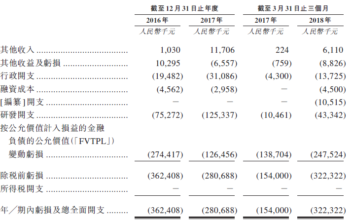 因产品尚未实现上市,迄今为止公司并无主营收入,其他收入仅包括银行利息收入及政府补助津贴,16年及17年其他收入分别为103万元、1171万元,对应亏损分别为3.6亿、2.8亿元。