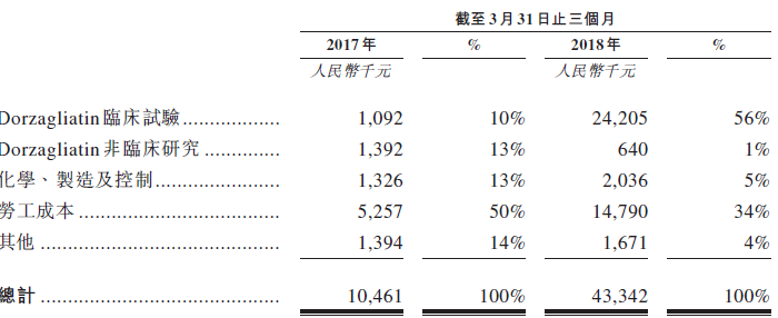 看研发开支分项,因Dorzagliatin 开启III期临床试验,加上年内开展的的额外第I期临床试验,Dorzagliatin临床试验及劳工成本占比及同比增幅突出,截至18年3月31止三个月,两项占总研发开支比例分别高达56%及34%,同比增幅均达到2倍以上,尤其是临床试验开支从上期的109万元剧增至2429万元。