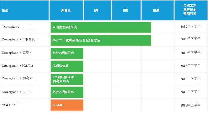公司目前有两款在研产品Dorzagliatin与mGLUR5。Dorzagliatin为公司主打产品,是一种葡萄糖激酶激活剂(GKA),作为2型糖尿病单药疗法,其与二甲双胍的联用疗法目前正开展III期临床试验,与其他获批的2 型糖尿病治疗方案的联合疗法计划在2018 和2019 年开展临床试验。另一款在研产品mGLUR5用于治疗柏金逊病左旋多巴诱导的运动障碍(PD-LID),计划19年上半年开展I期临床试验,研发管线如下: