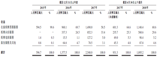 此外,公司提供娱乐电商服务,销售衍生品以及广告服务。从下表公司业务收益明细可以看出,票务服务占据收入主要组成,随着2016年以来娱乐内容服务的快速增长,公司收入来源进一步拓展,盈利能力得到提高,2017年在线娱乐票务服务占总收入的58.5%,娱乐内容服务份额为33.4%,电商服务及广告业务仍在孵化。