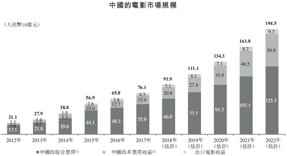 随着我国居民消费能力的增长,电影基础设施的快速发展,我国电影市场规模迅速增长,目前已位居世界第二,仅次于美国。从2012-2017年复合增长率达29.2%,市场规模达761亿元,预计到2022年增长到1945亿元,年复合增长为20.7%。其中综合票房市场在2017-2022年年复合增长率达到17.5%,预计将在2019年超越美国成为最大的电影市场。