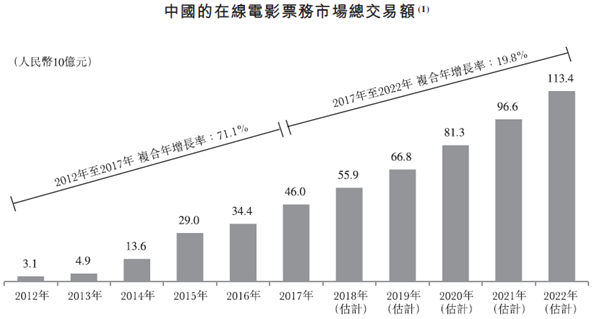 而移动互联网的发展正在改变人们的消费方式,较高的渗透率及移动支付发展,驱使购票活动从线下转移到线上,在线电影票务市场迅速发展,从2012-2017年在线电影票务渗透率从18.4%增至82.3%,市场总交易额从31亿元增长至460亿元,预计到2022年将进一步增长至1134亿元。