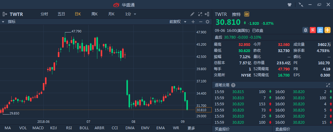 美东时间9月5日,推特CEO杰克多西和Facebook COO雪莉桑德伯格参加美国参议院听证会,就互联网干涉美国选举一事接受询问。由于市场担忧美国对社交媒体监管政策将因此收紧,推特股价当日下跌6.06%,9月6日继续下跌5.87%,听证会以来两个交易日累跌近12%。关于下跌后的推特是否值得投资,下文是具体分析: