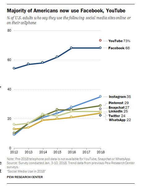 从渗透率上比较,公司也不占优势。根据Pew2018年的社交媒体报告,在美国成年人中仅有24%的美国成年人使用推特,但Facebook和YouTube的渗透率分别达到68%和73%,远远领先其他社交媒体。