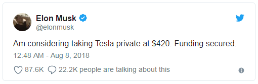 目前无可否认的是,特朗普的“推特治国”已经让公司成为美国国内政治讨论的第一大平台,而最近特斯拉的私有化风波中,马斯克的相关推文获得巨大的关注度,表明出公司同时也是重大商业议题的舆论出口: